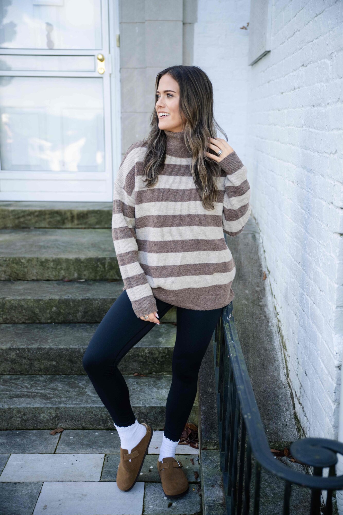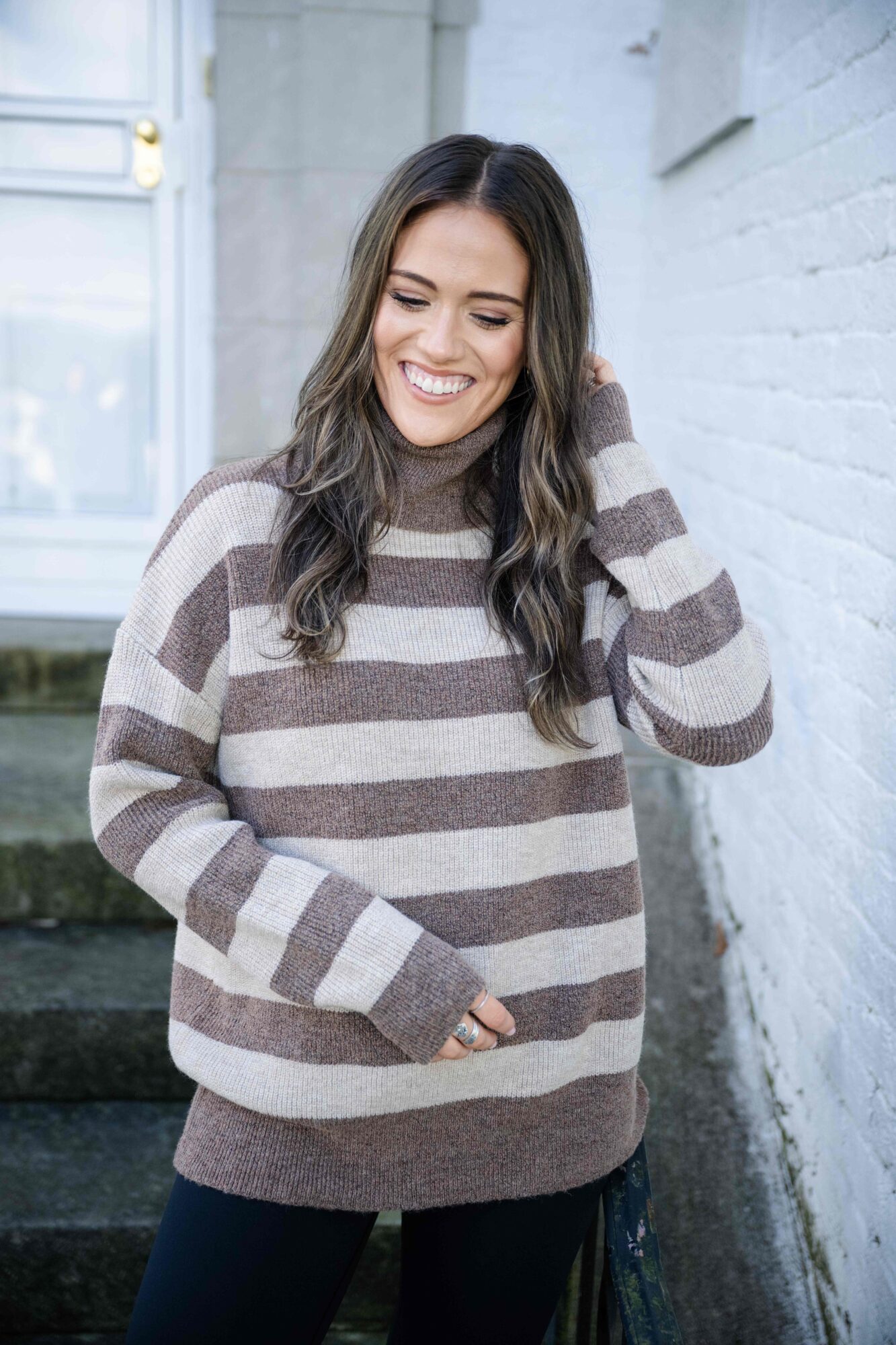 This cozy knit sweater features classic stripes, creating a timeless and versatile piece. The comfortable fabric ensures warmth and comfort.