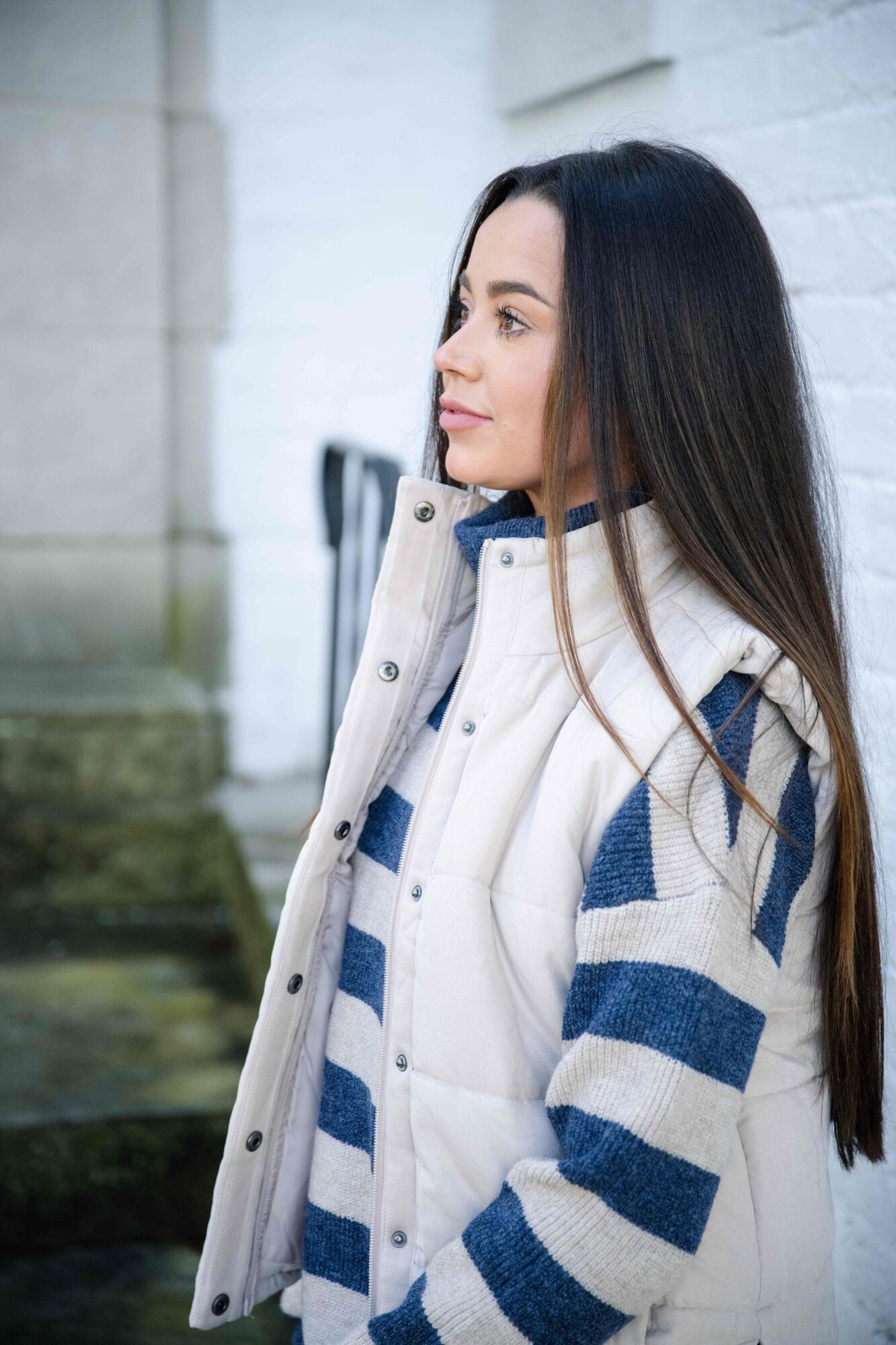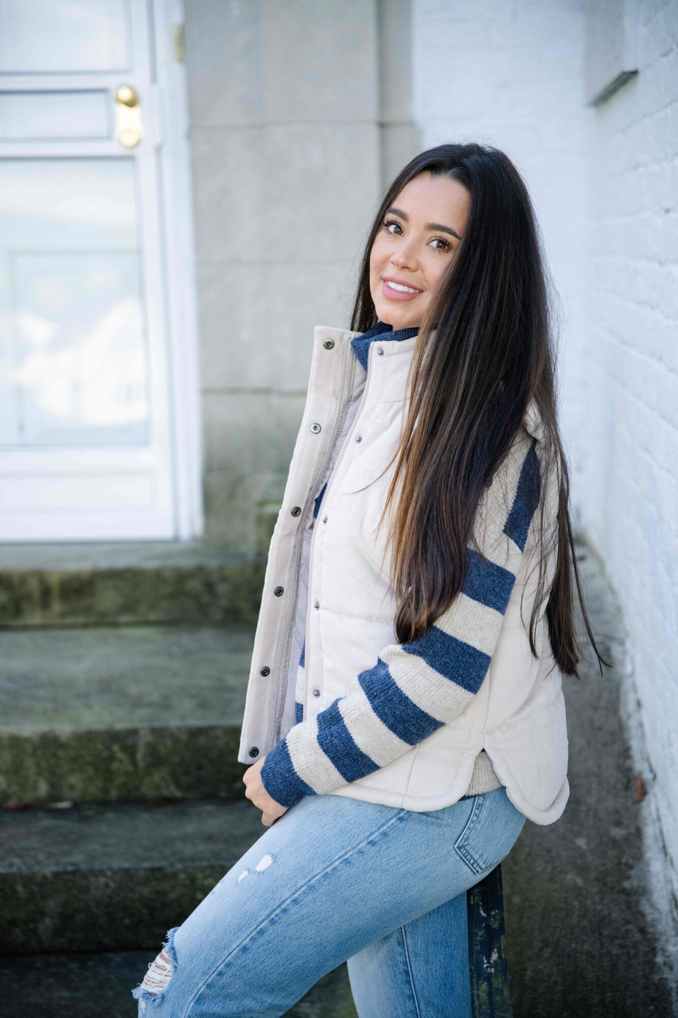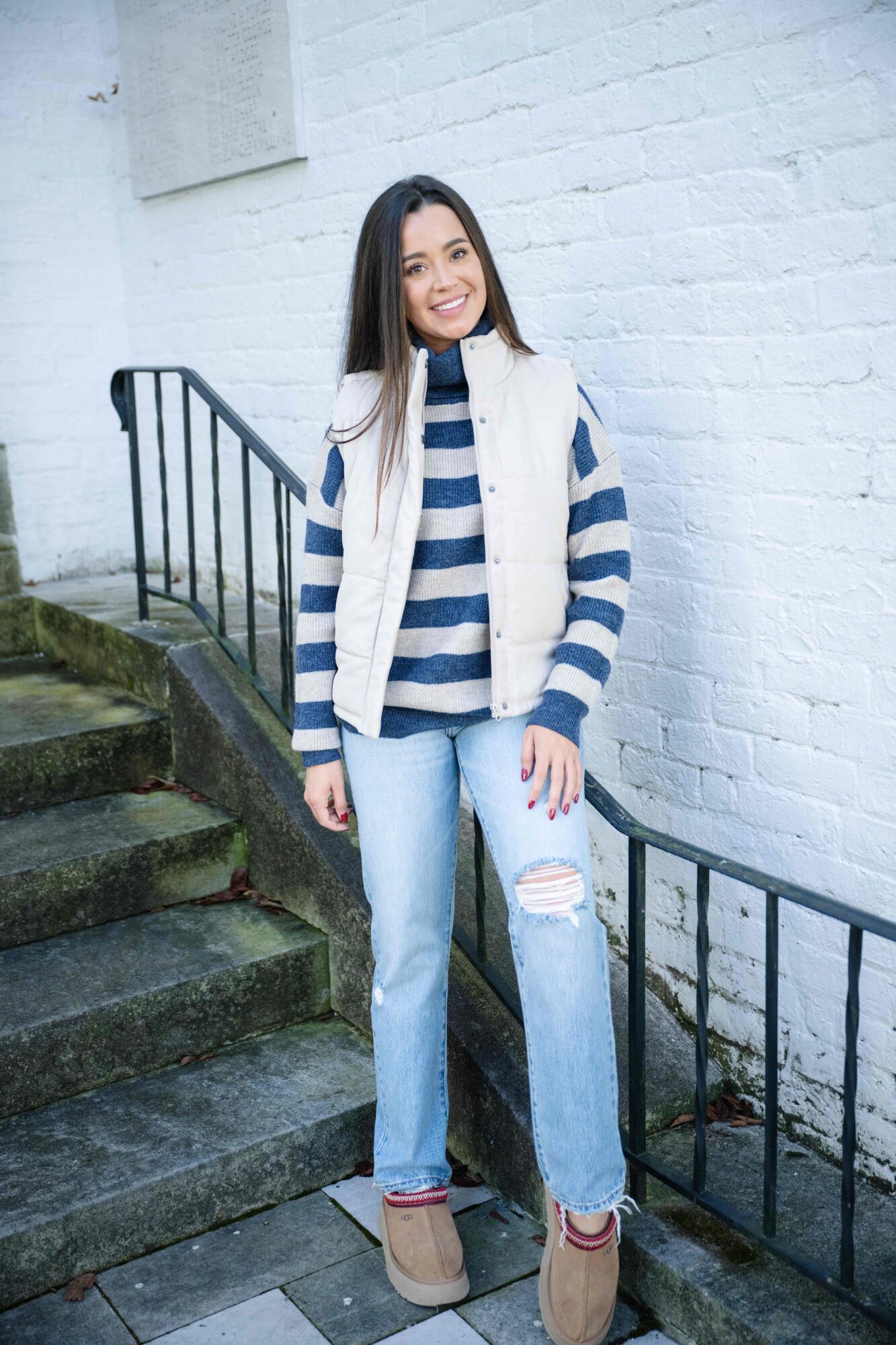 This cozy knit sweater features classic stripes, creating a timeless and versatile piece. The comfortable fabric ensures warmth and comfort.