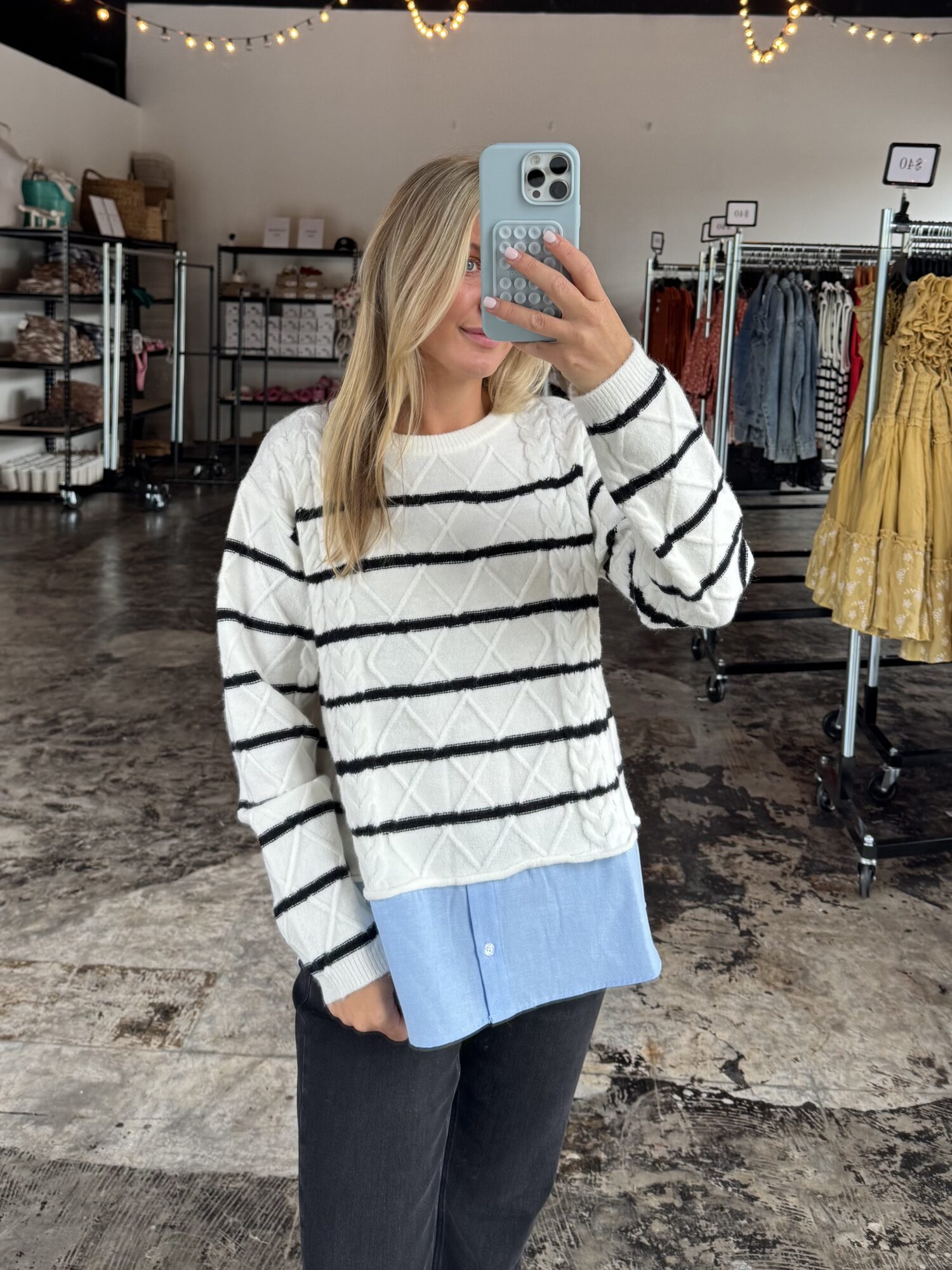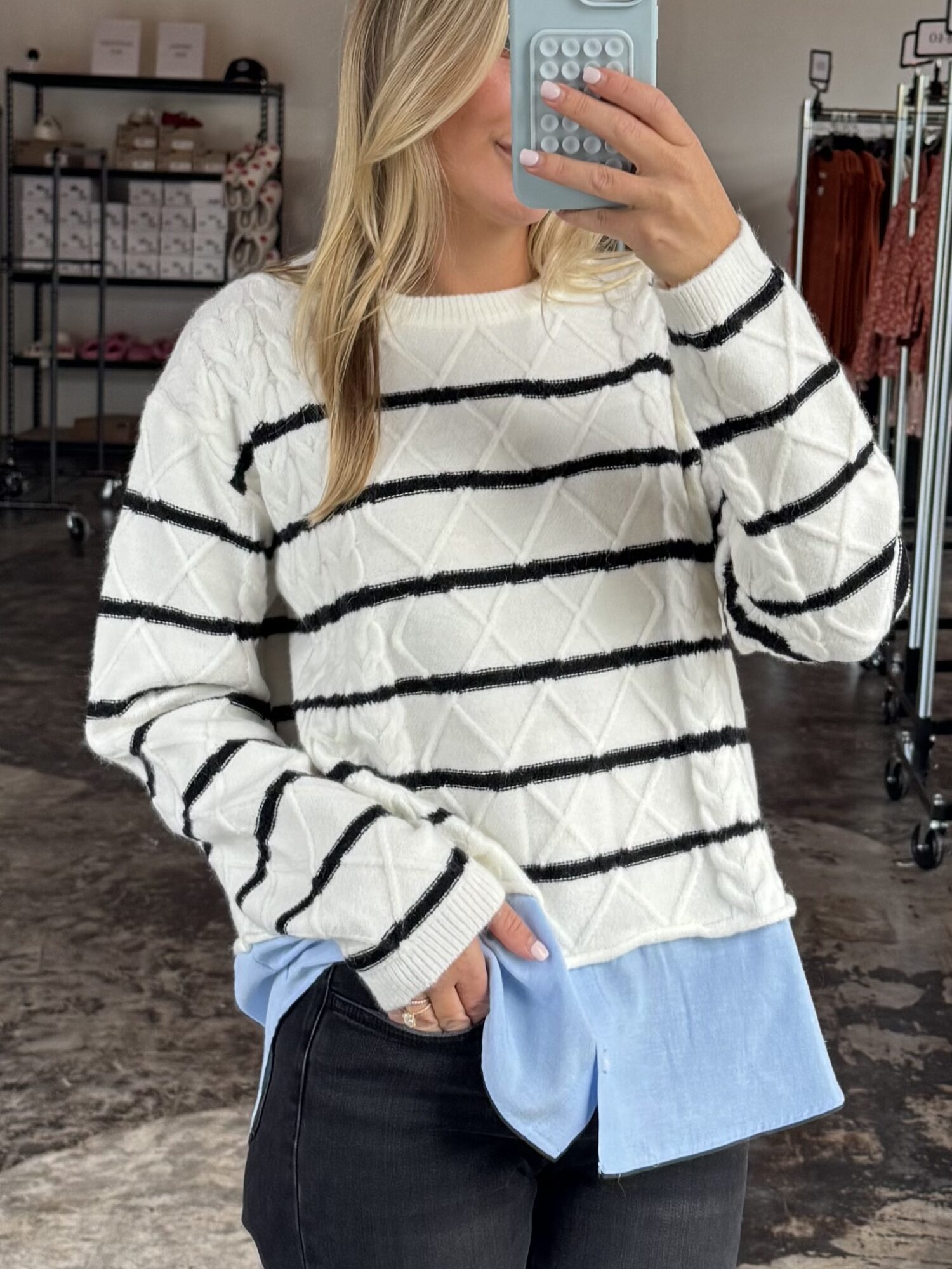 This unique striped sweater creates a cleverly designed layered blouse built-in creating a stylish and versatile peace for any occasion. The exterior showcases a classic striped pattern in timeless colors, while the interior reveals a delicate, blue blouse.