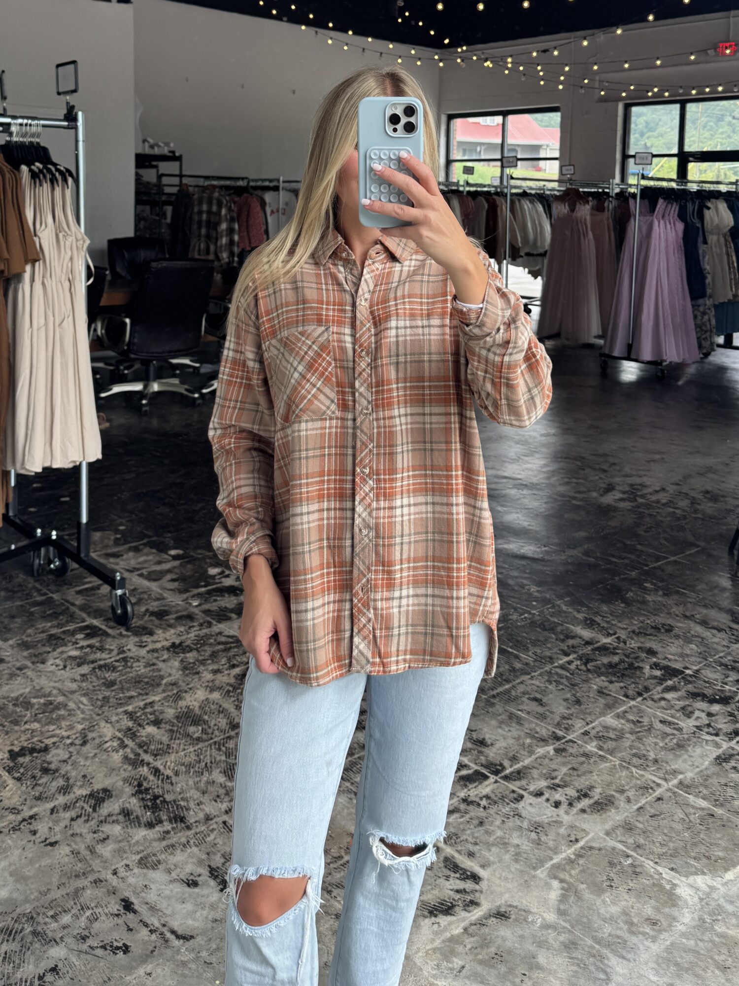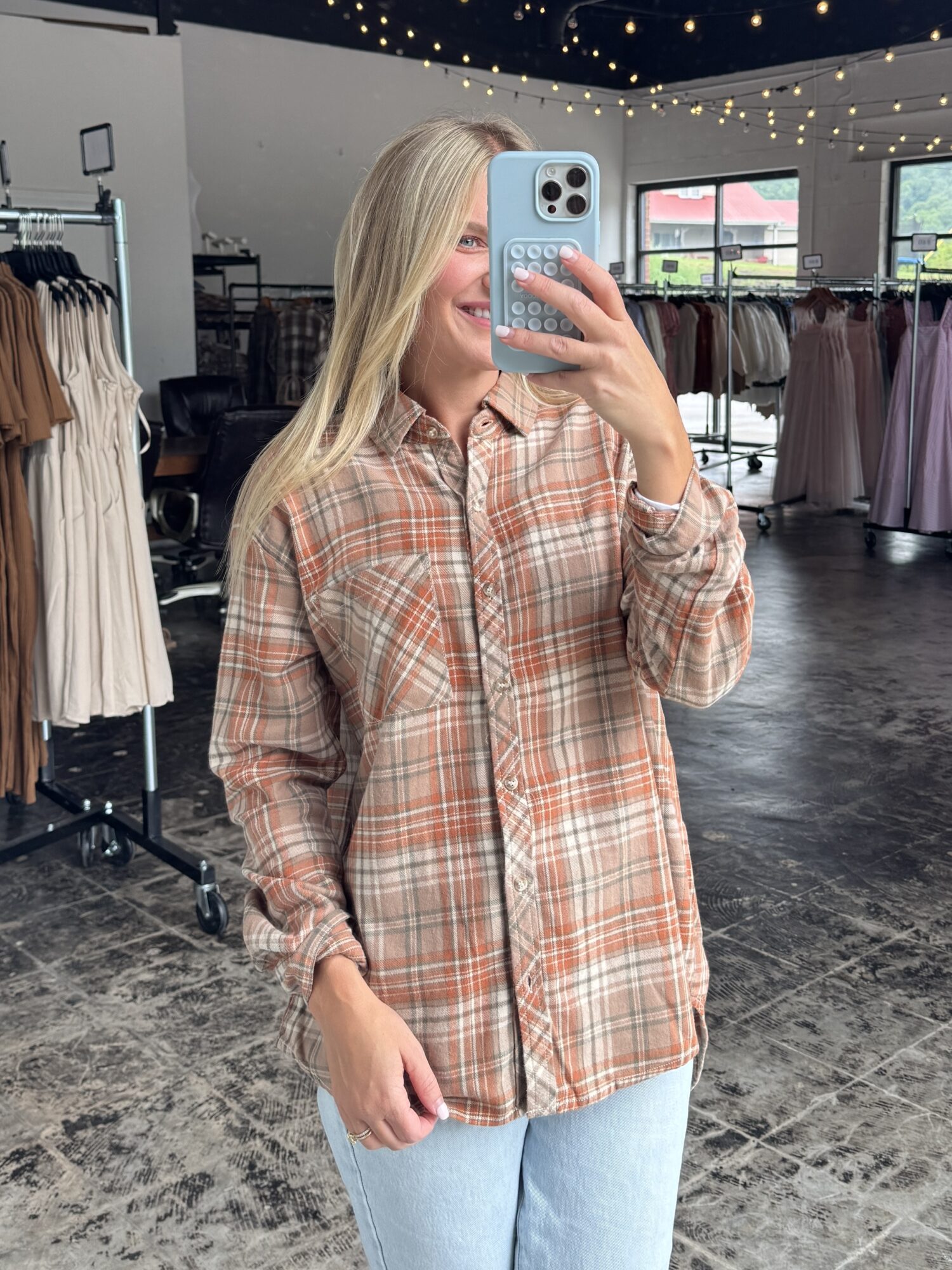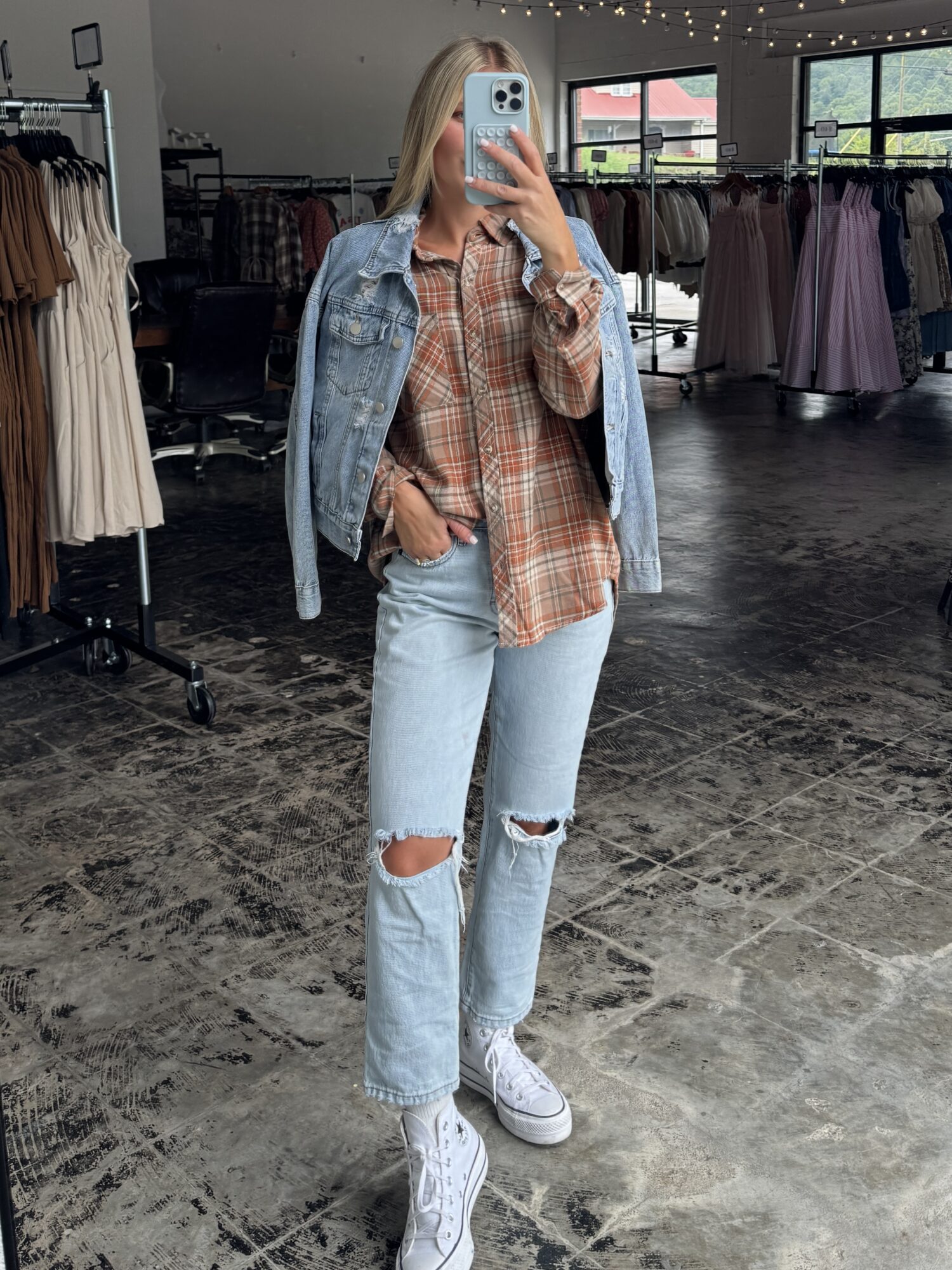 Meet your new fall favorite — the flannel that’s as cute as it is cozy. With its soft, laid-back feel and timeless plaid pattern, it’s the perfect layer for pumpkin patch strolls, apple picking, or just sipping cider on the porch. Easy to throw over tees, sweaters, or dresses, this flannel makes every fall outing a little more picture-perfect.