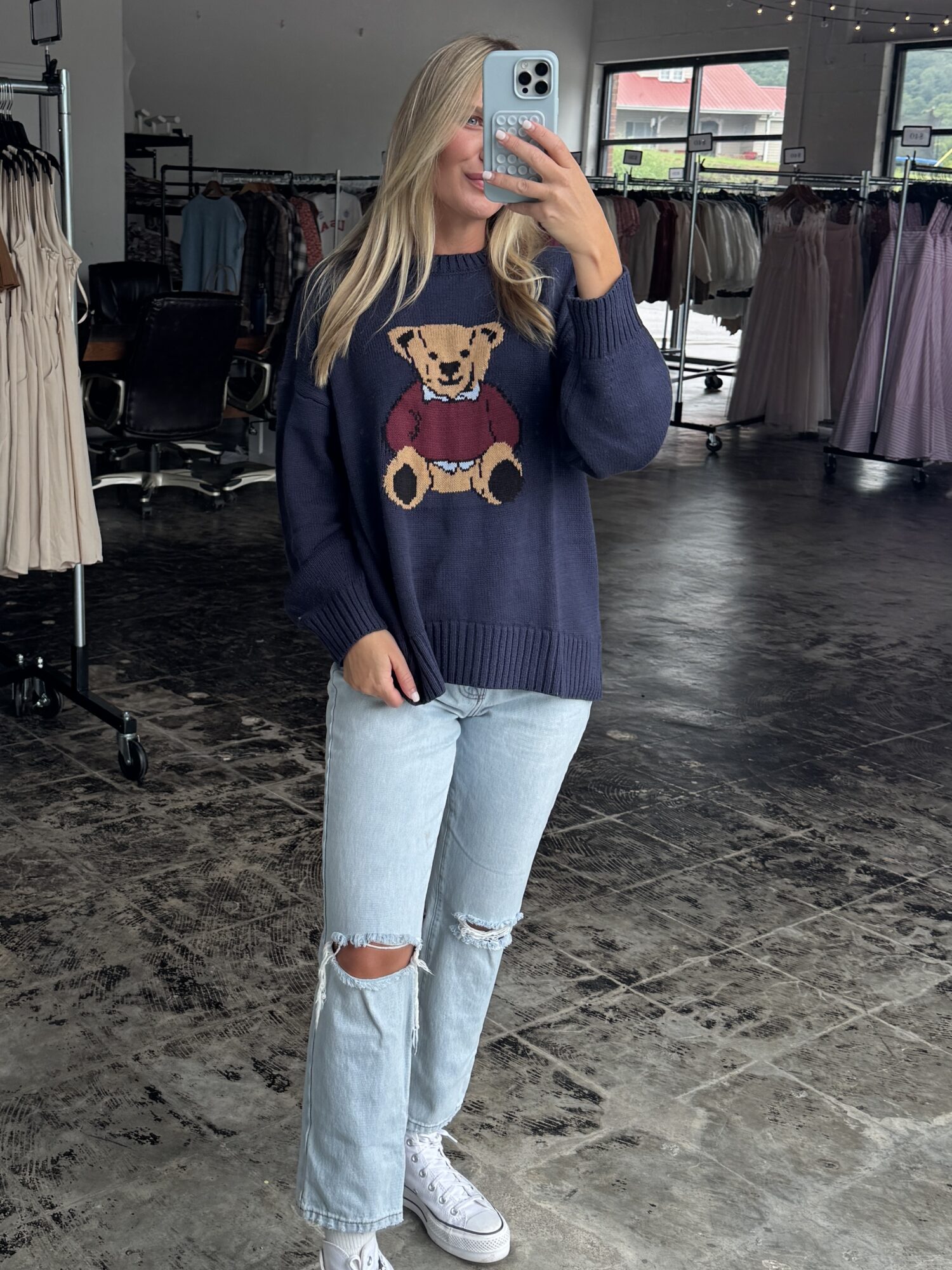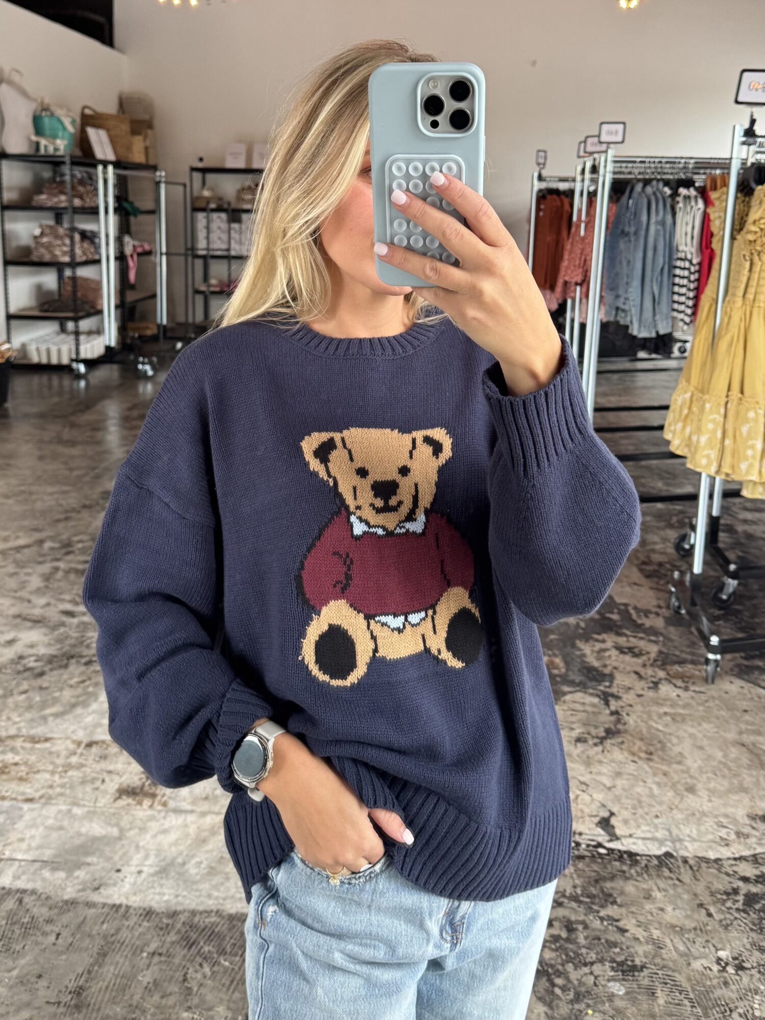 Snuggle season just got a whole lot cuter. Our Navy Knit Teddy Bear Sweater brings all the cozy vibes with a dash of nostalgic charm. Featuring a soft navy knit and an adorable teddy bear graphic front and center, this sweater is basically a warm hug you can wear.The relaxed fit makes it perfect for layering over your fave collared shirt or rocking solo with jeans and boots. Whether you’re headed to brunch or binge-watching your comfort show, this sweater is your go-to for cute and cozy.