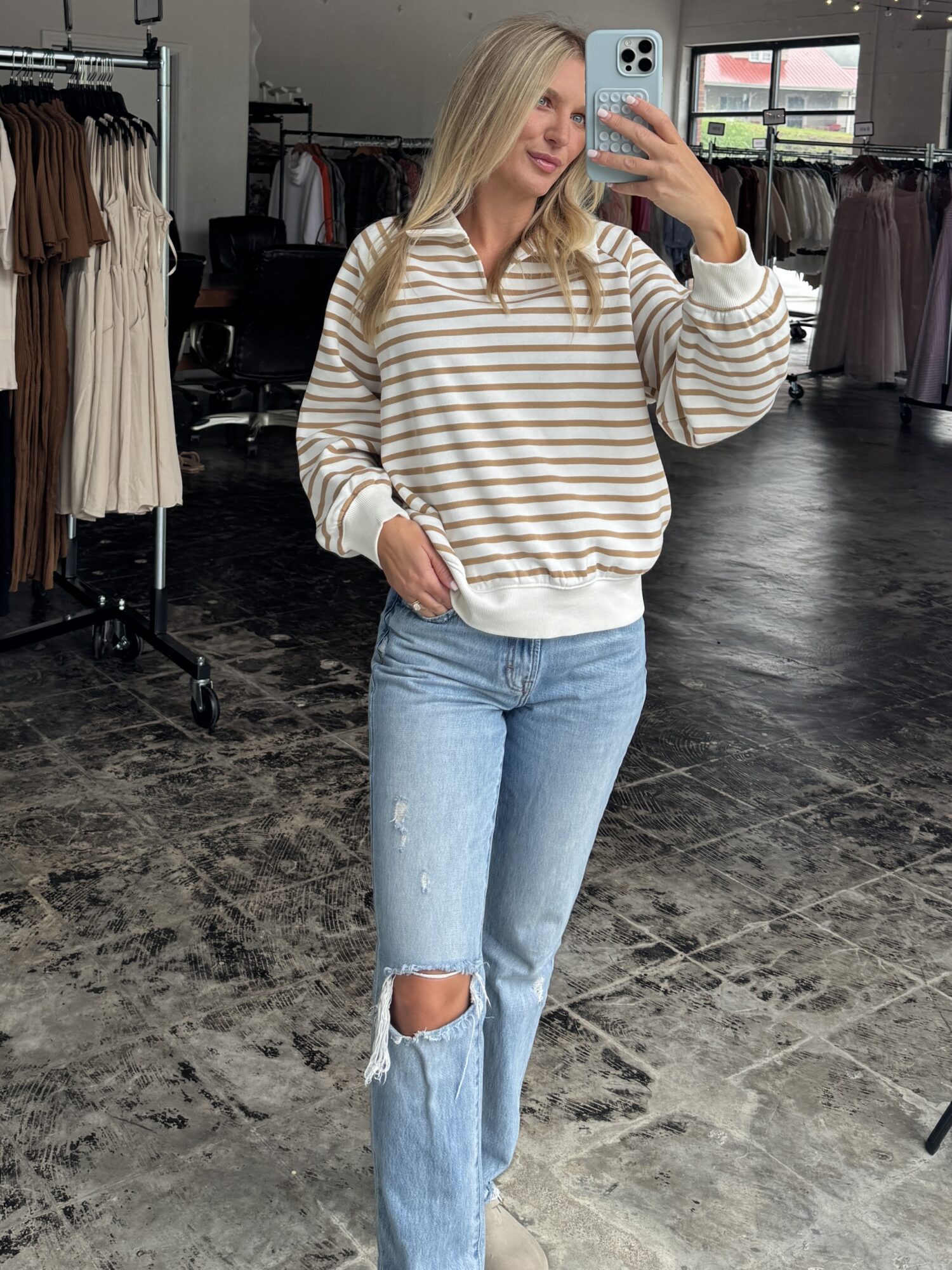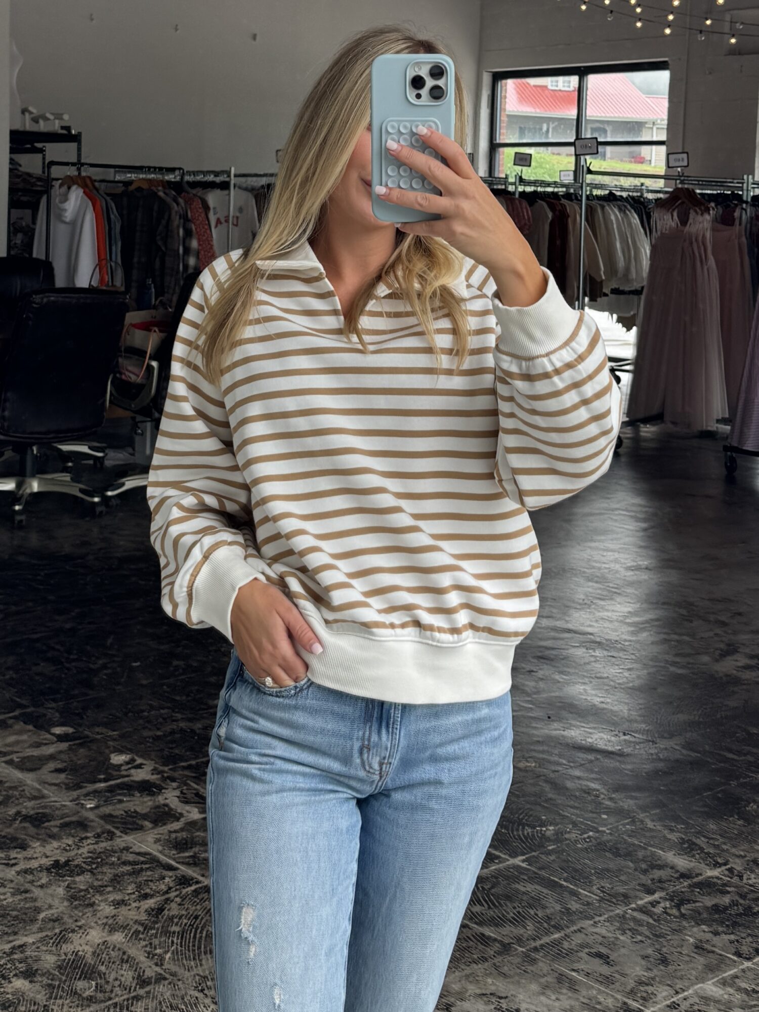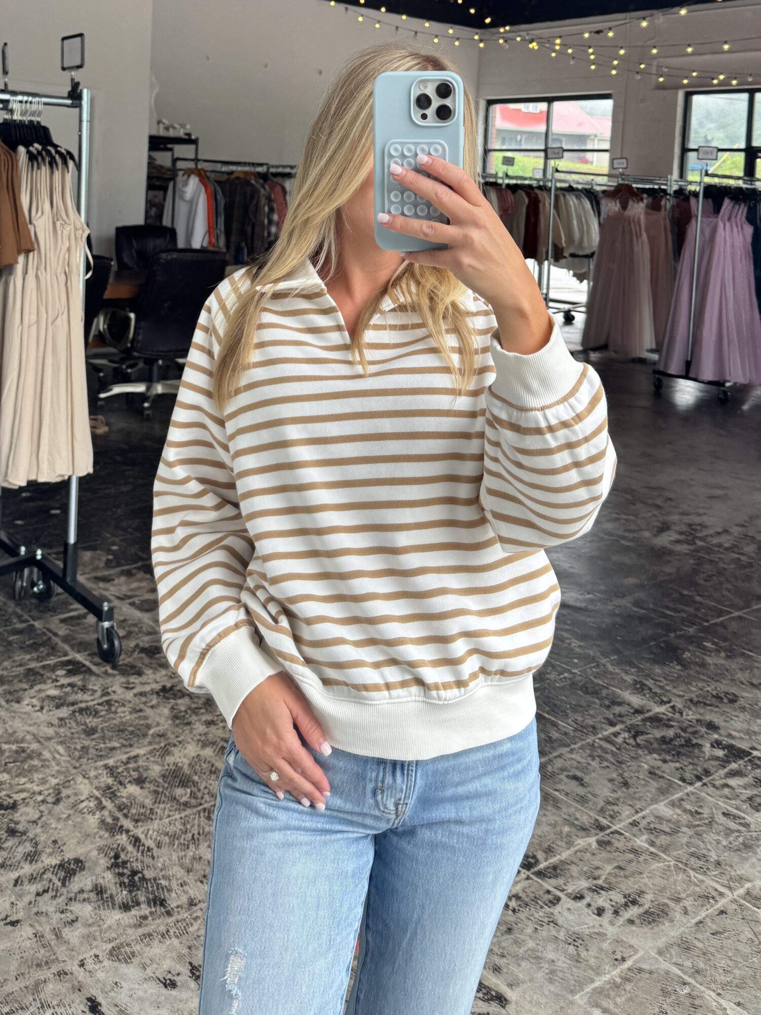 Stay cozy and cute with this taupe and white super soft sweater, featuring a classic collar for a polished yet laid-back vibe. The neutral color combo makes it easy to style, while the buttery-soft feel keeps you comfy all day. Perfect for tossing on with jeans and sneakers for errands, or dressing up with boots for a crisp fall day out — this sweater is your new go-to for effortless autumn style.