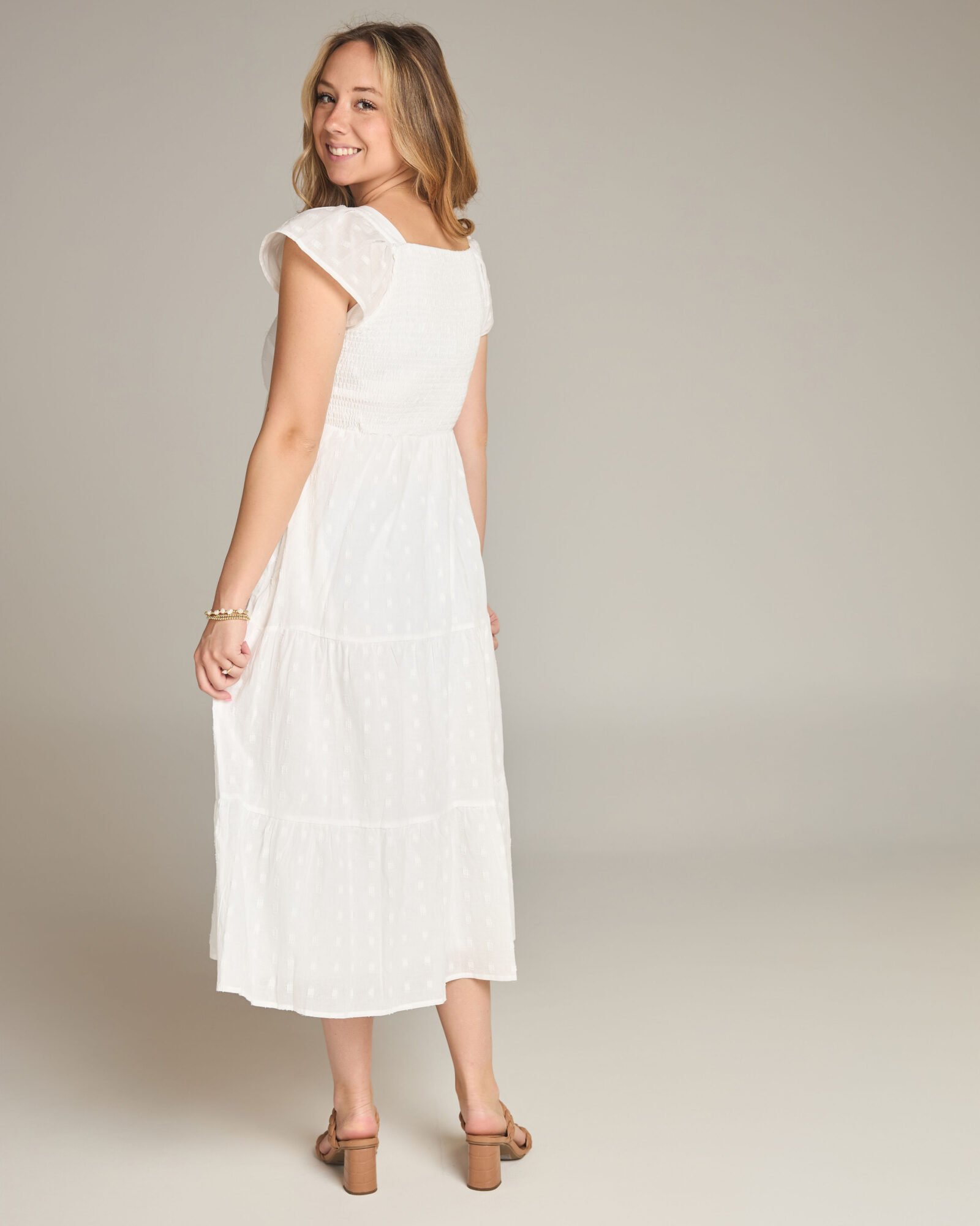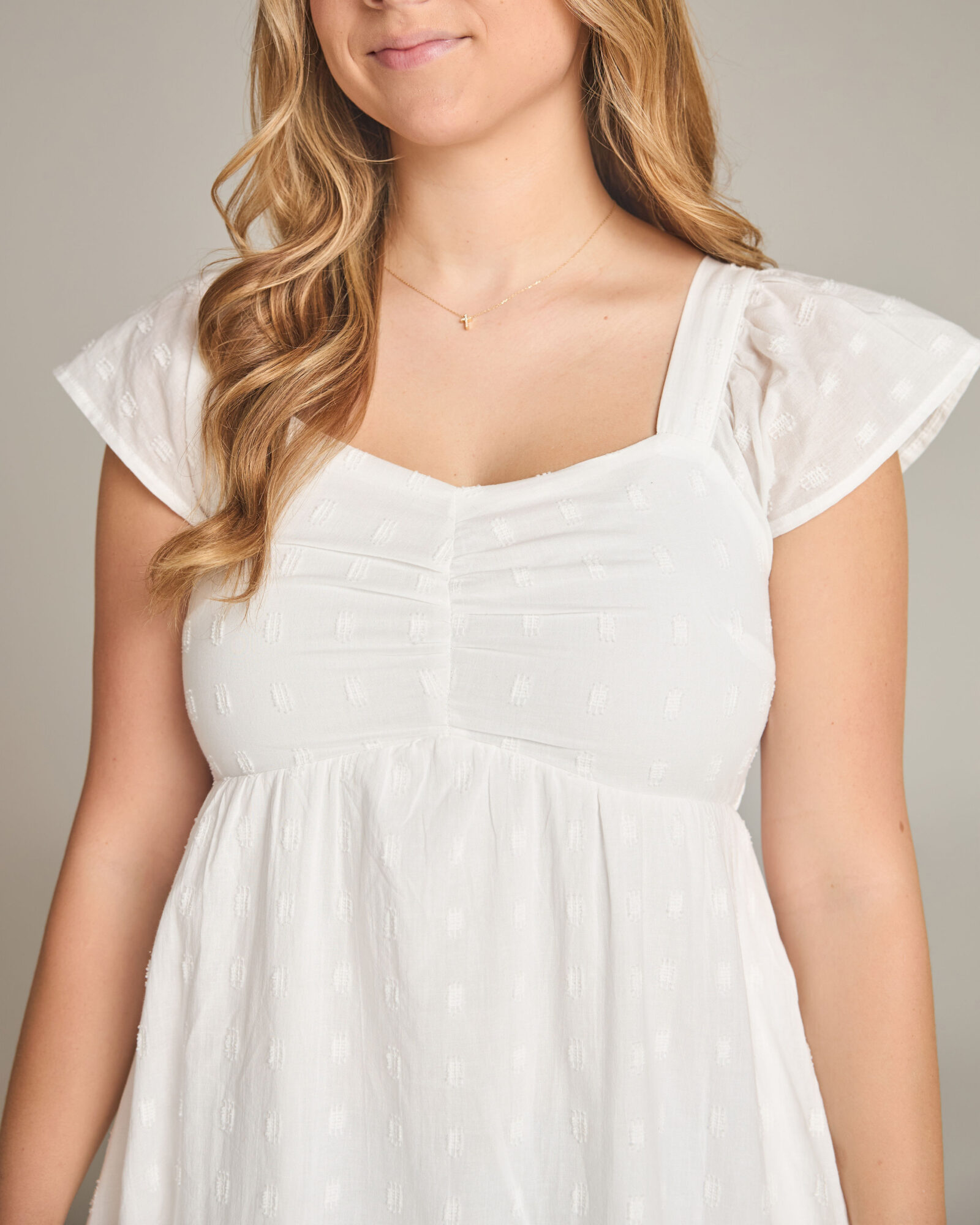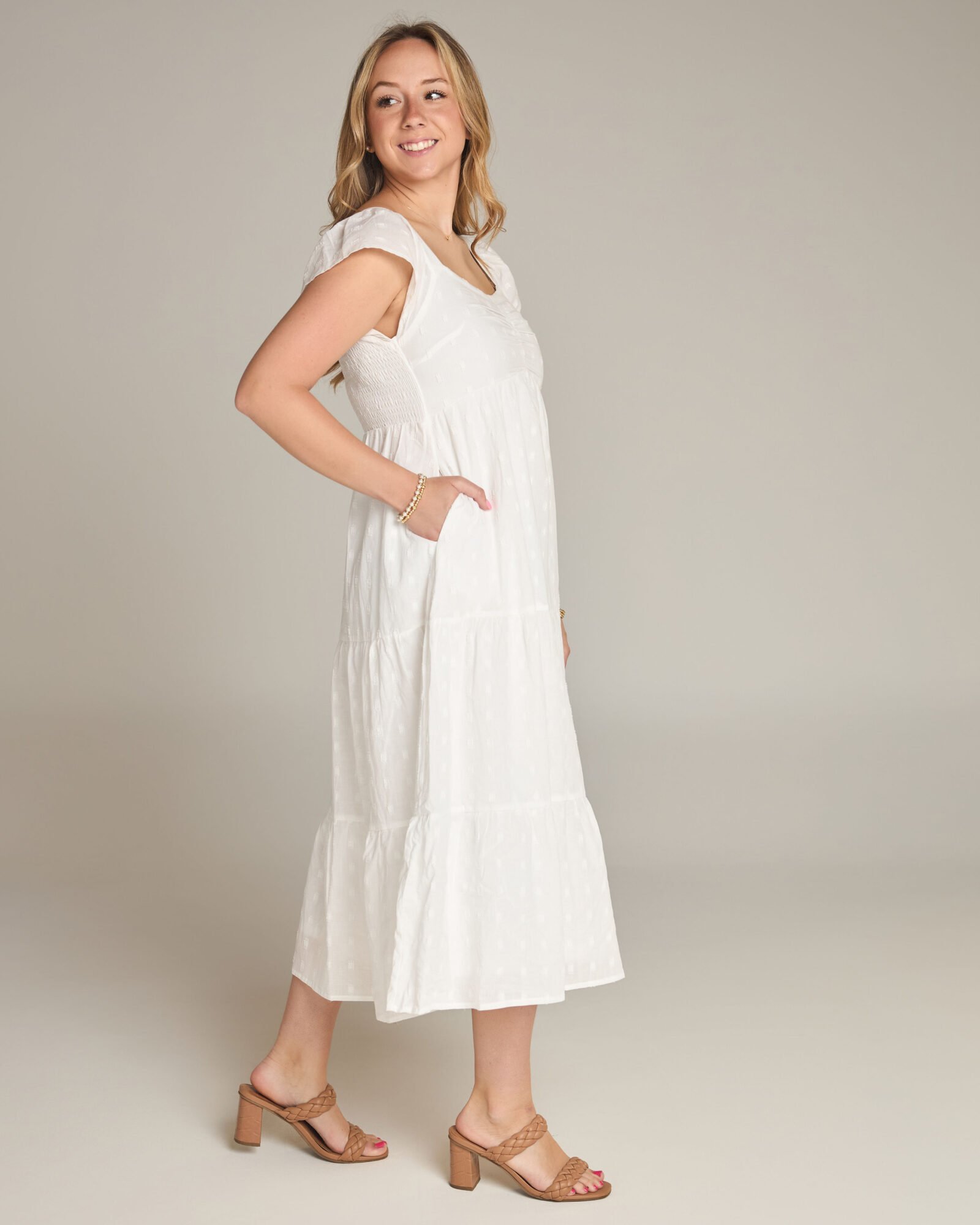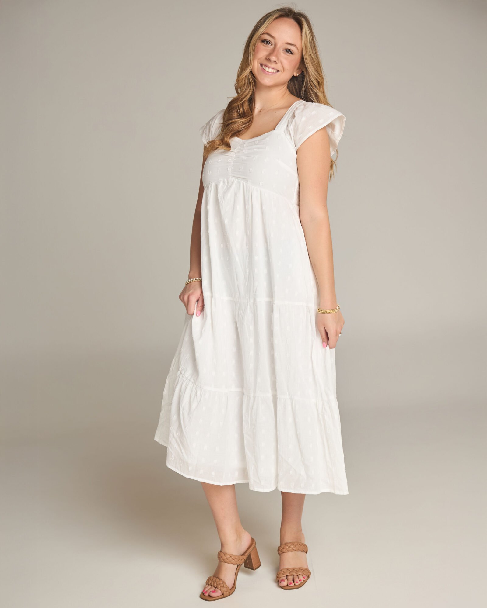A romantic white textured midi dress featuring a fitted bodice with a sweetheart neckline, delicate lightweight short sleeves, and a fully lined tiered skirt that adds effortless charm. Perfect for sunny days and special moments alike.