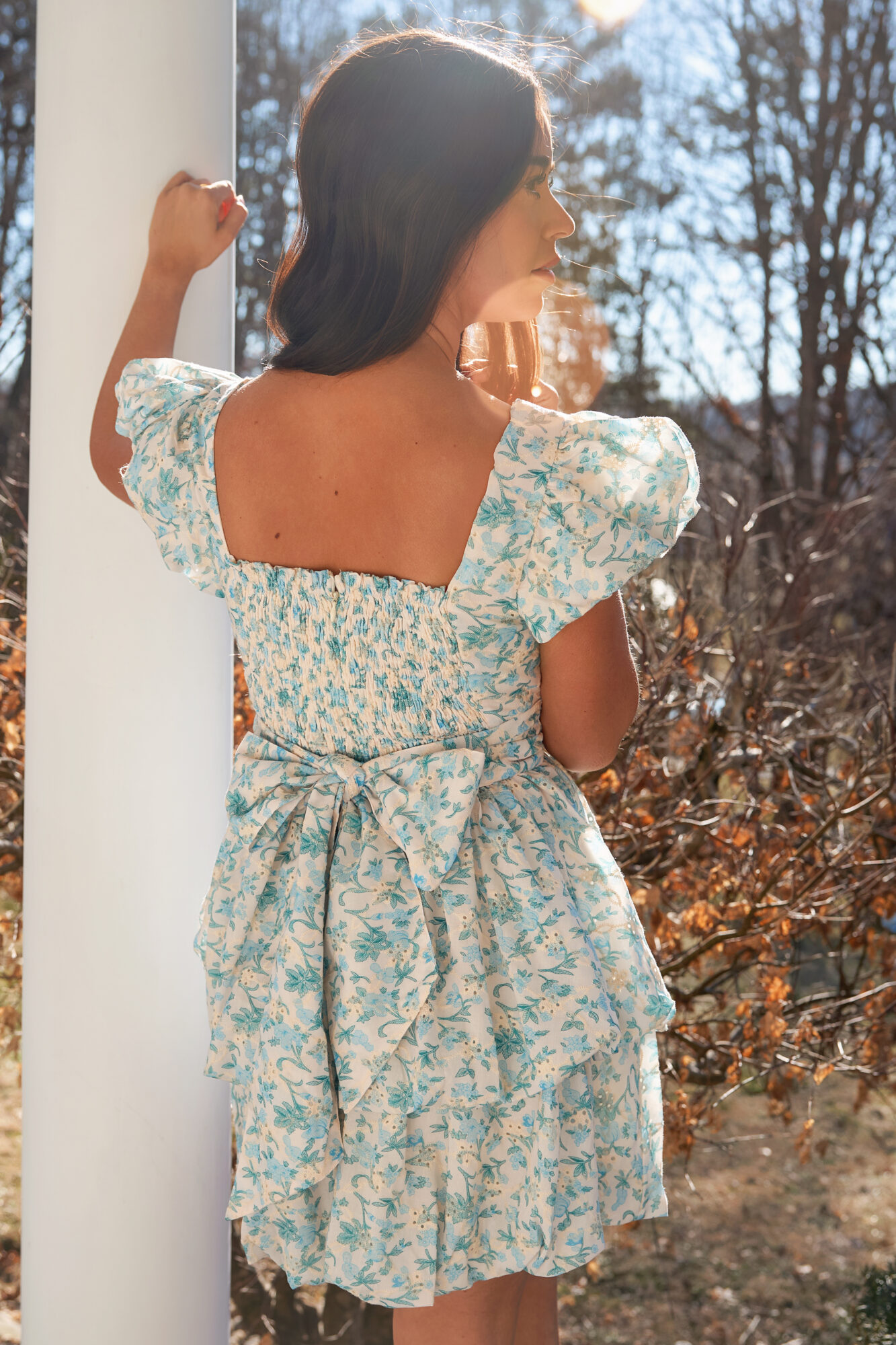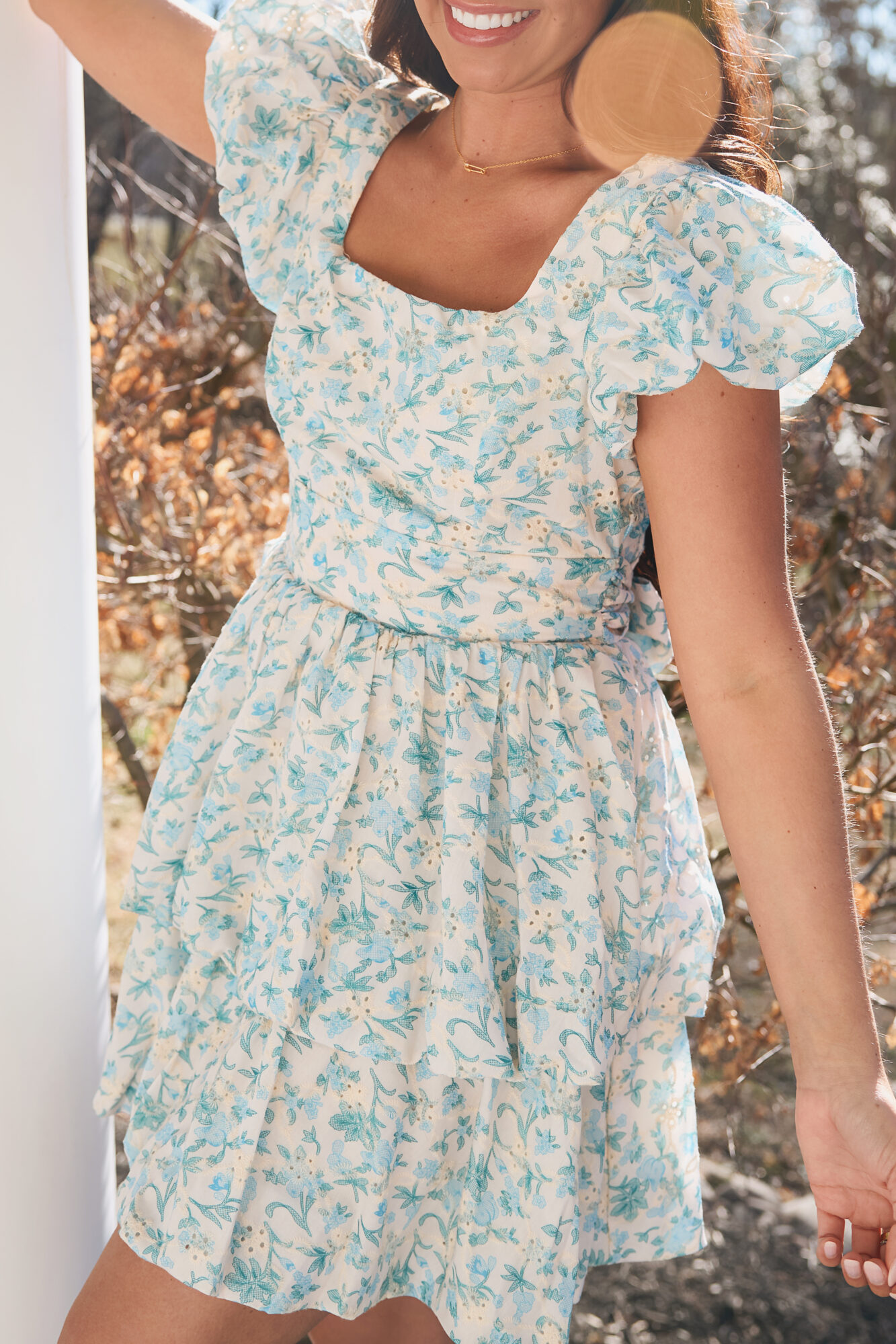 The Aria is a beautiful floral print dress featuring puff sleeves, layered ruffles, a square neckline, and a tied waist. This is the perfect summer dress for any occasion!